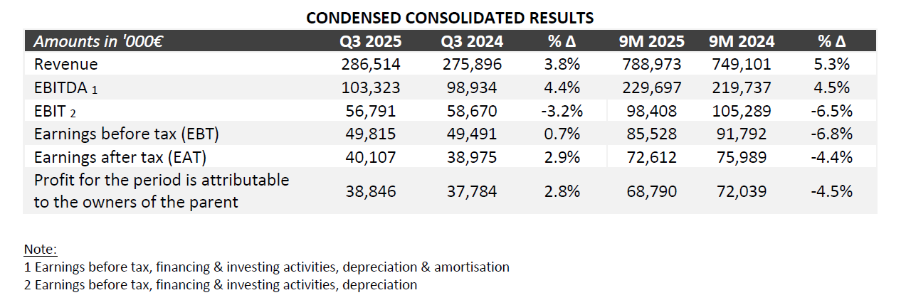 For the nine-month period, Revenue increased by 5.3%, reaching €789 million. EBITDA for the nine months amounted to €229.7 million, reflecting a 4.5% increase, while Earnings after Tax (EAT) amounted to €72.6 million.
